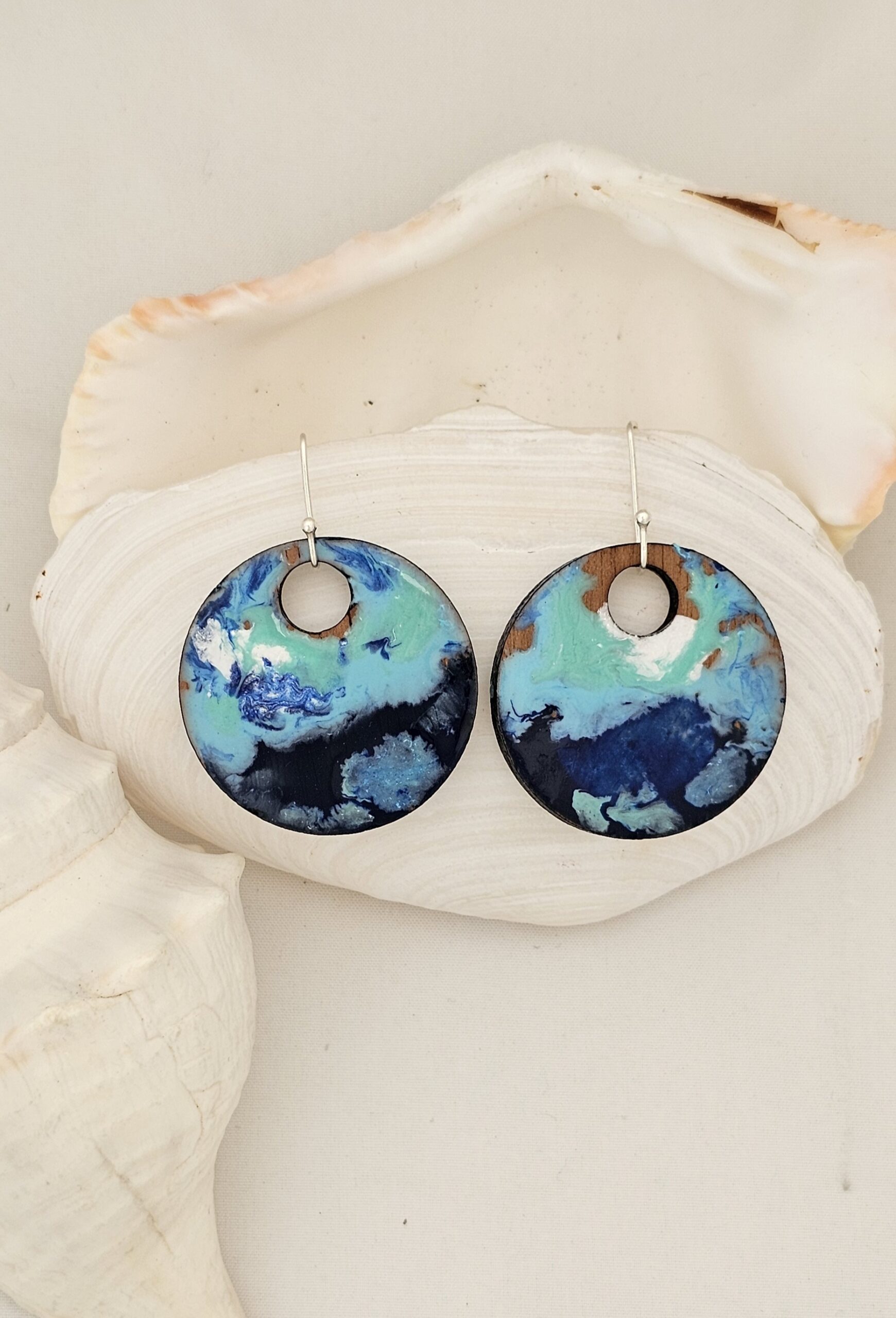 These partly enamelled Ocean Blue Retro Earrings feature hand-painted wooden discs with a playful retro cut-out design, finished with silver hooks. Lightweight and comfortable at 35mm in diameter, they’re perfect for everyday wear. Each pair is handmade and individually enamelled, meaning no two are ever the same — giving you a truly unique splash of coastal colour.