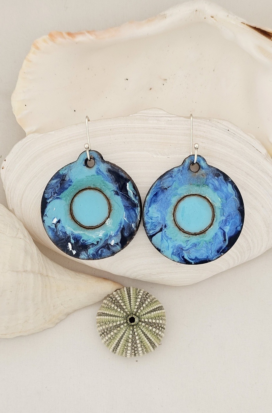 Handcrafted with a vibrant coastal aesthetic, these Ocean Blue Enamelled Earrings feature solid round wooden discs with a striking turquoise centre, finished with silver hooks. Each piece is individually enamelled, giving every pair its own unique pattern and character. Lightweight and comfortable at 35mm in diameter, they’re the perfect statement accessory for everyday wear or a touch of seaside charm.
