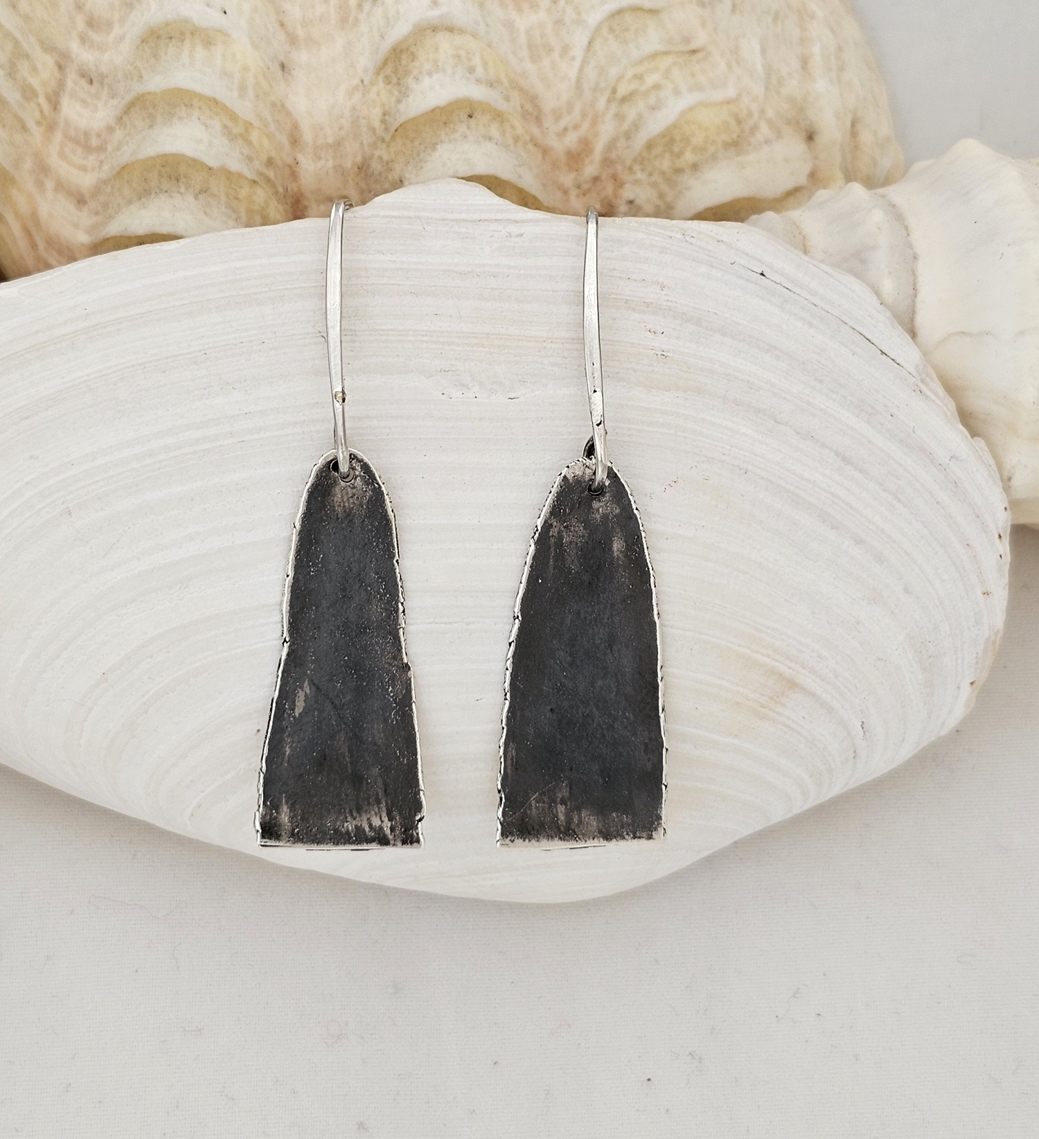 Oxidized solid silver rolled sheet earrings Mainly black Silver dangly hooks Being individually handcrafted, size and shape will vary