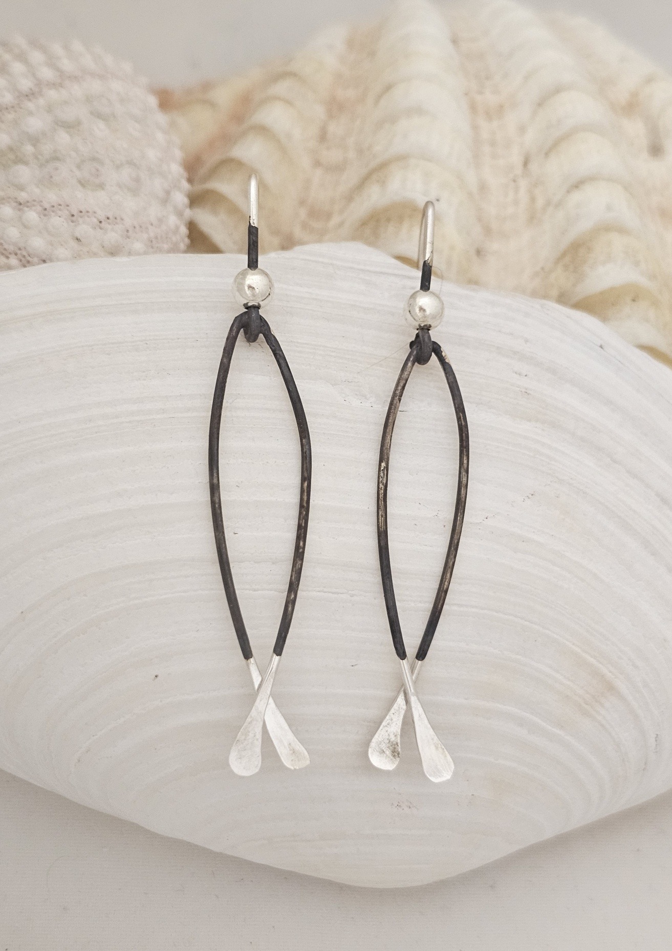 Oxidised & polished silver earrings in a slim fish design Hanging from silver earring hooks Being individually handcrafted, shapes and sizes will vary